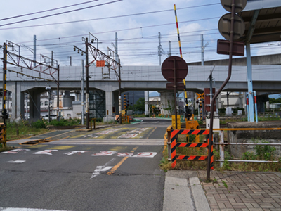 ![]() 曽根田駅前にある踏切。真新しい新設アプローチ線が見えます。 |